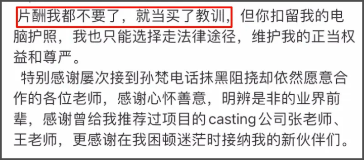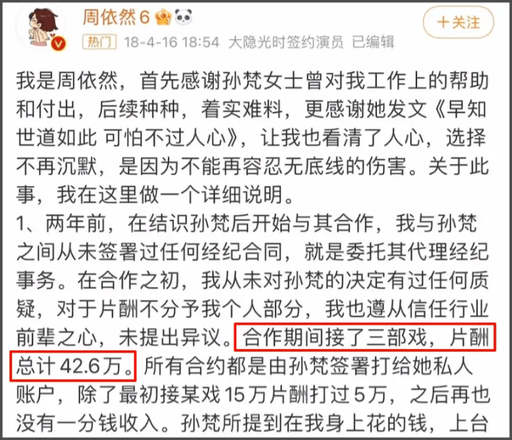 网友深扒后发现,周依然的资源优势早就有迹可循。她之前和前经纪人孙梵闹过合同纠纷,双方各说各的理,但从当时的沟通细节能看出来,她刚进圈资源就不一般 —— 有些热剧的试镜机会,经纪人都拿不到,她却能通过别的渠道搞定。解约的时候她也相当硬气,直言 40 多万的片酬不要了,就当买个教训,还自曝家里在业内有人脉,解约后立马有亲戚帮她介绍了新公司,还送上了电影资源,这人脉背景确实不简单。
