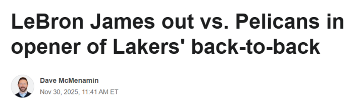 詹姆斯今日确定缺战鹈鹕! 本赛季已缺阵15场: 再休3场将无缘评奖