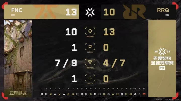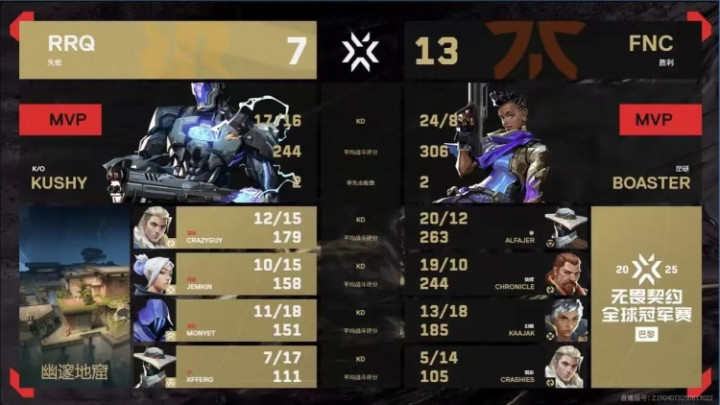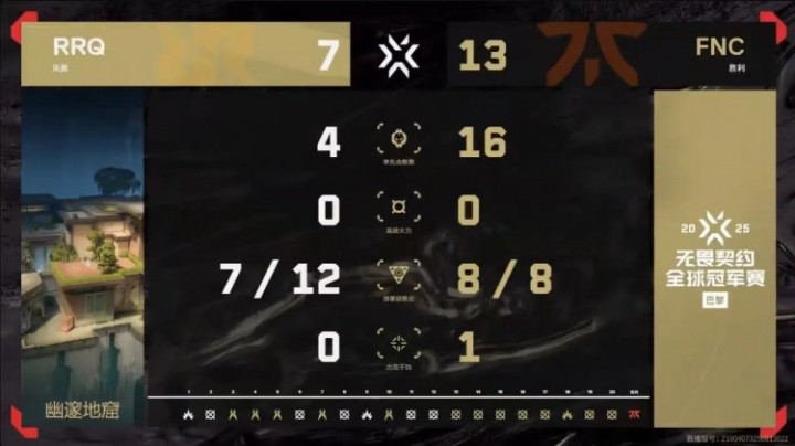 上半场RRQ打出7-5的比分领先,但是下半场大B老师直接脑子枪法均在线,RRQ面对FNC的进攻完全无法防守,FNC成功拿下RRQ斩获胜利!