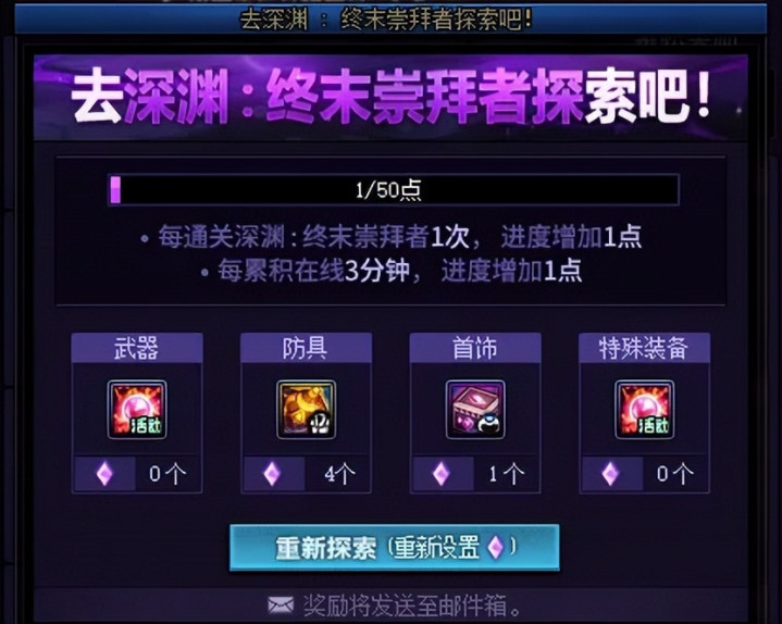 然后就需要站街、或者刷深渊积攒进度,达到50进度就可以解锁所选择的史诗装备罐子啦!
